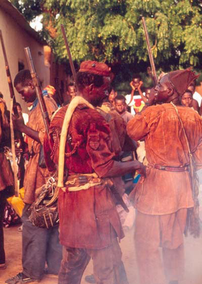 The Bamanan hunters, who are famed for their hunting skills and feared for their magic powers, wear reddish-brown outfits that are dyed by the bogolan method. Sometimes black mud-decorations are added. The second male age group of the youth association wears hunter outfits during the masquerade, as does the masked N'Domo dancer.